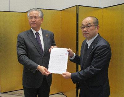 合新潟小林会長(右)から当協会殖栗会長へ要請書を手交